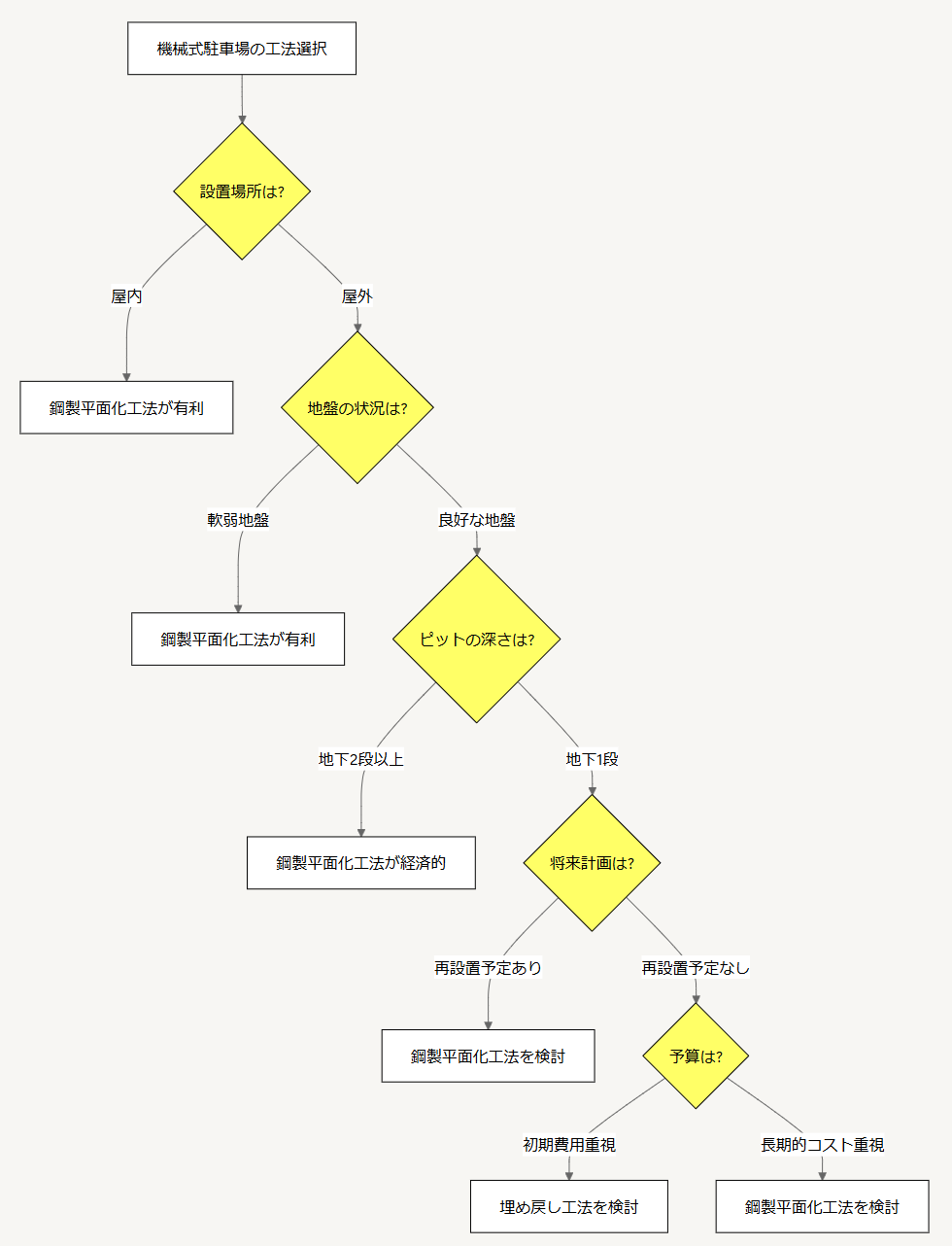 以下のフローチャートでは、設置場所や地盤の状況、将来の再設置計画などの条件に応じて、どちらの工法が適しているかを簡単に判断できます。初期の検討段階での参考としてご活用ください。